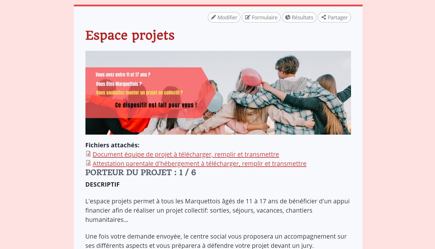 L’espace projets permet à tous les Marquettois âgés de 11 à 17 ans de bénéficier d’un appui financier afin de réaliser un projet collectif: sorties, séjours, vacances, chantiers humanitaires…